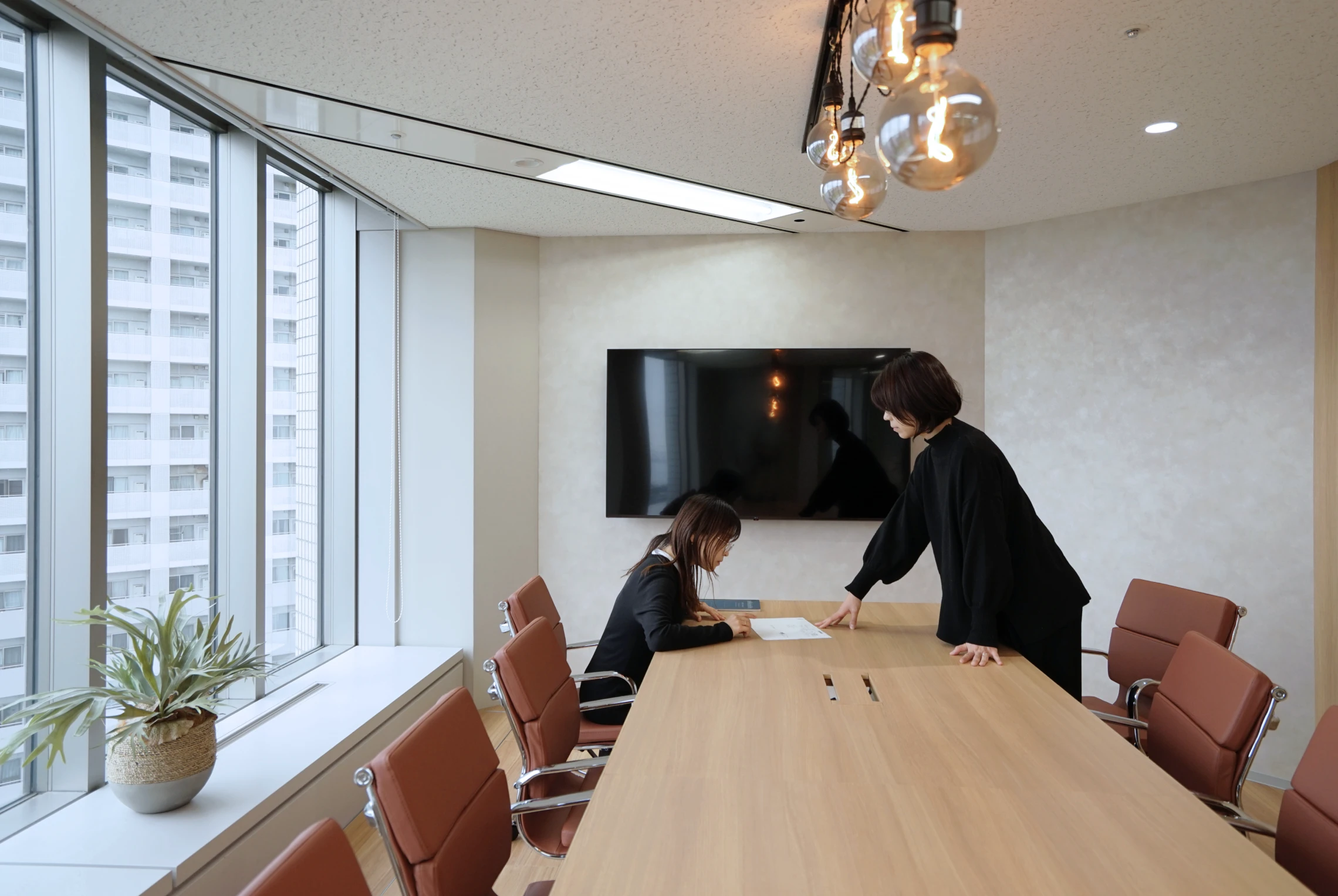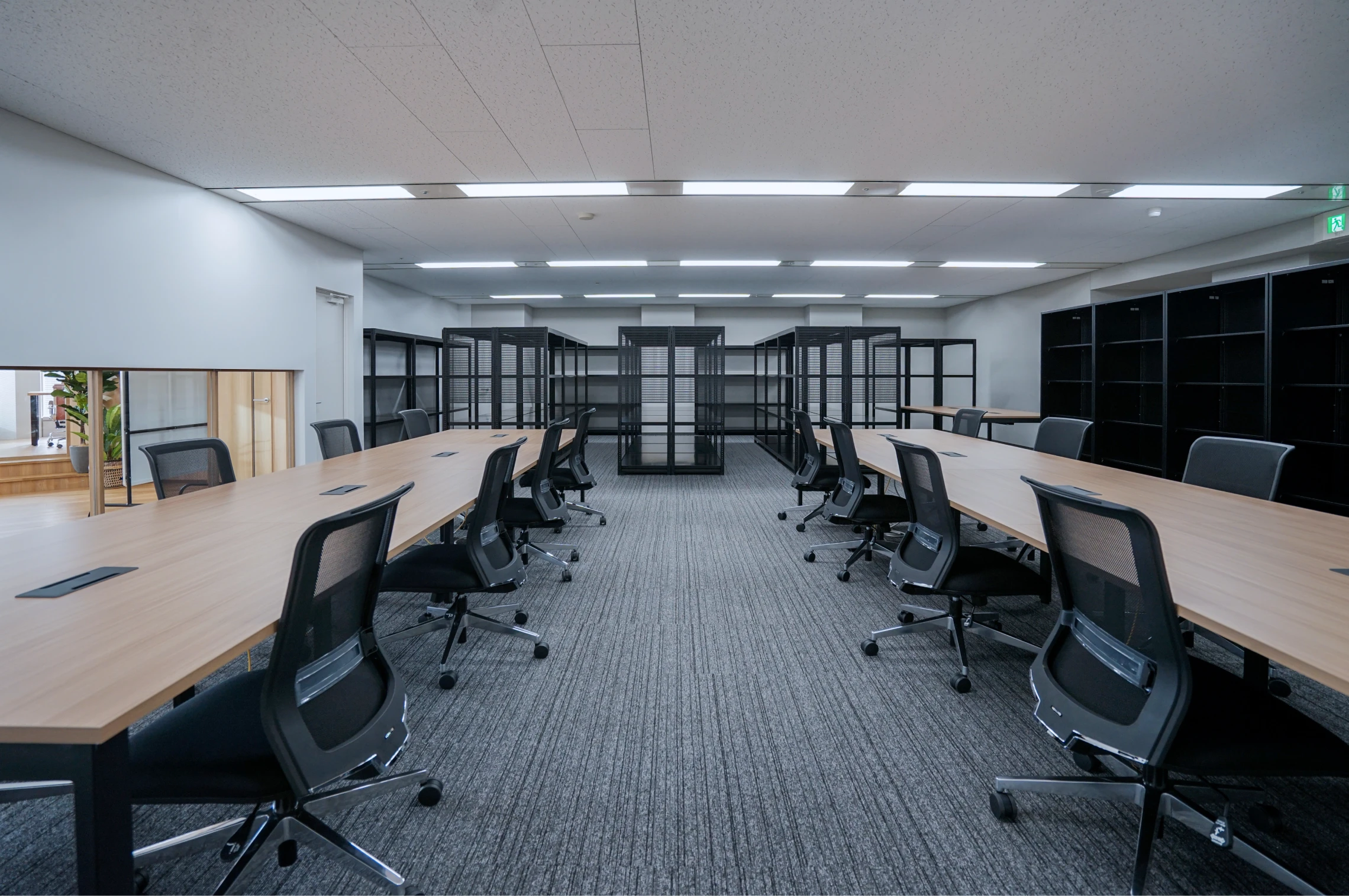 執務エリアと在庫管理スペースは視線と動線が自然に連続するよう設計し、日々の作業が滞りなく進む環境を整備しました。また、会議や研修、イベントなど、多様な用途に対応できる可変性の高いミーティングエリアを計画し、状況に応じて空間の表情を柔軟に変えられるようにしました。さらに、清潔感と信頼性を基調とした色彩や素材を選定し、リィツメディカルのブランド価値を空間に投影することで、来訪者が自然と安心感を抱く環境を実現しました。
