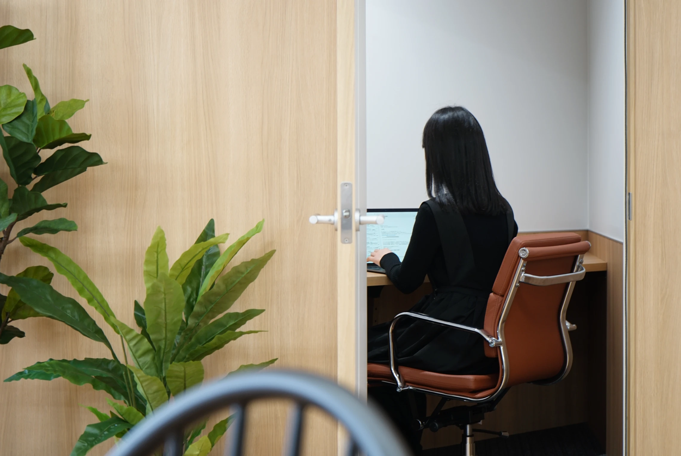 フリースペースは研修やイベントの開催に活用され、社員のスキル向上に貢献しています。入り口のソファスペースは、来客や社員に快適な空間を提供し、オフィス全体の雰囲気が向上しました。また、オンラインミーティングや集中作業に最適な集中ブースも完備しており、静かな環境で効率的に業務を進めることができます。