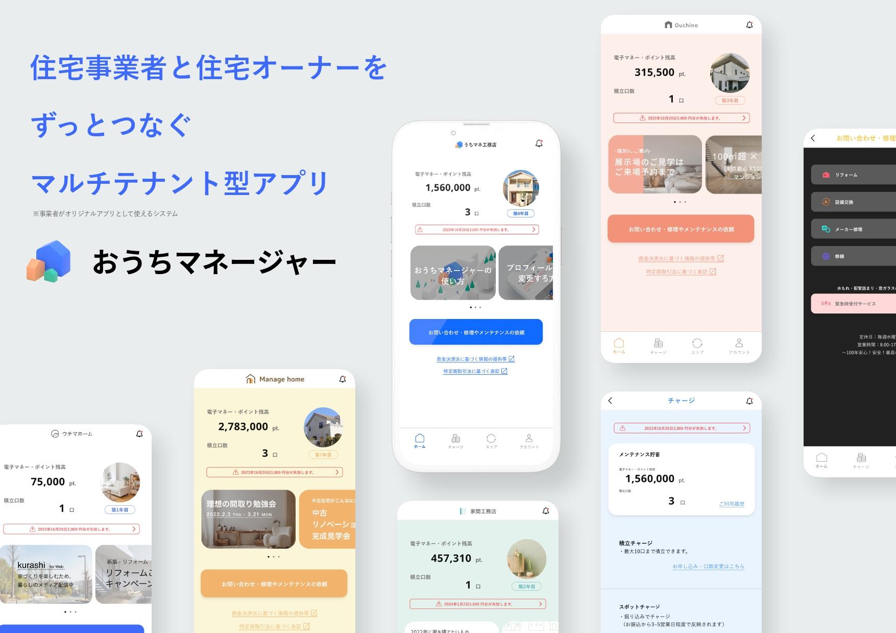 「おうちマネージャー」は、スピーディかつ低コストで自社版を導入・運用できる住宅事業者専用スマホアプリ。顧客との関係性の活性化を望む住宅事業者と、適切なメンテナンスで、長く住み続けたい住宅オーナーという双方のニーズをマッチング。
