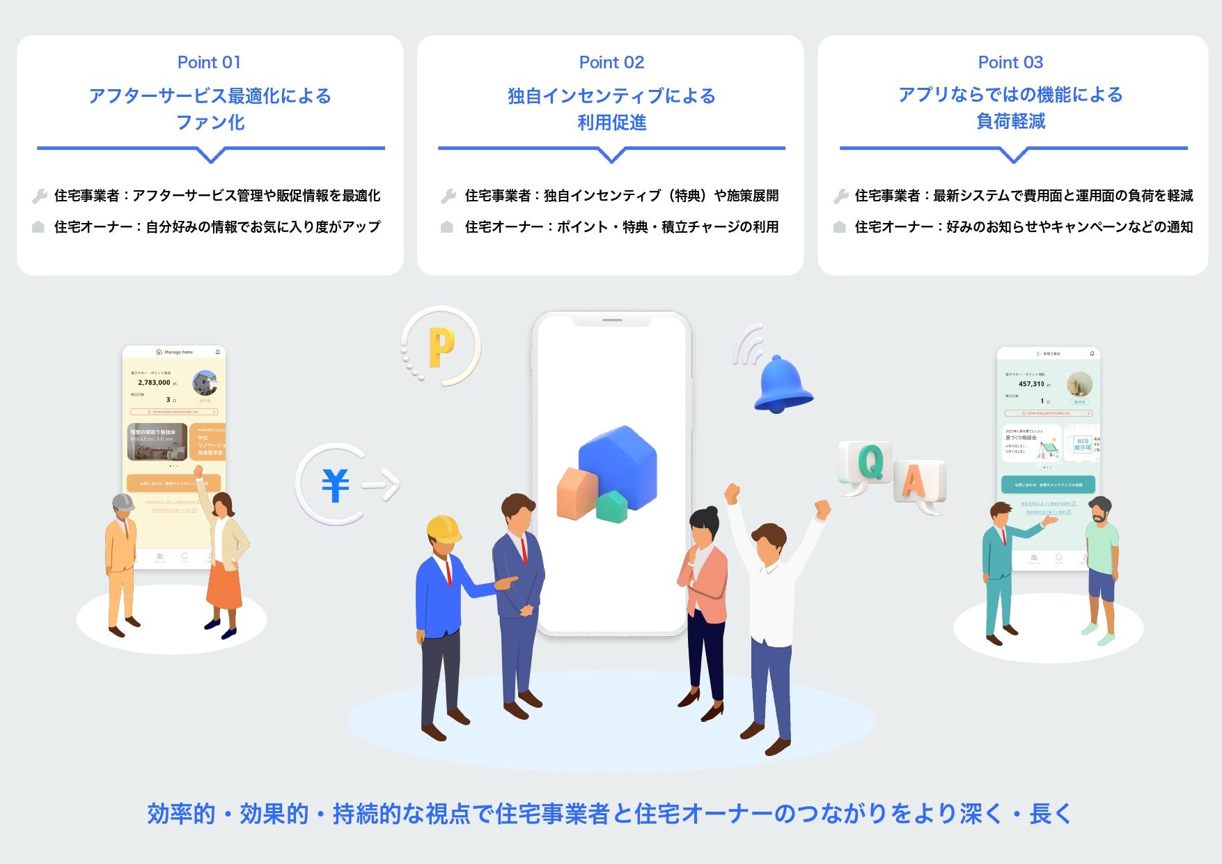 スピーディかつ低コストで自社版を導入・運用できる住宅事業者専用スマホアプリ。①アナログ業務DX化、②独自インセンティブでの差別化、③アフターサービス最適化、④効果的販促によるファン化、⑤住宅寿命の長期化など、長年住宅業界が抱えてきた課題をワンストップで解決するマルチテナント型アプリです。
