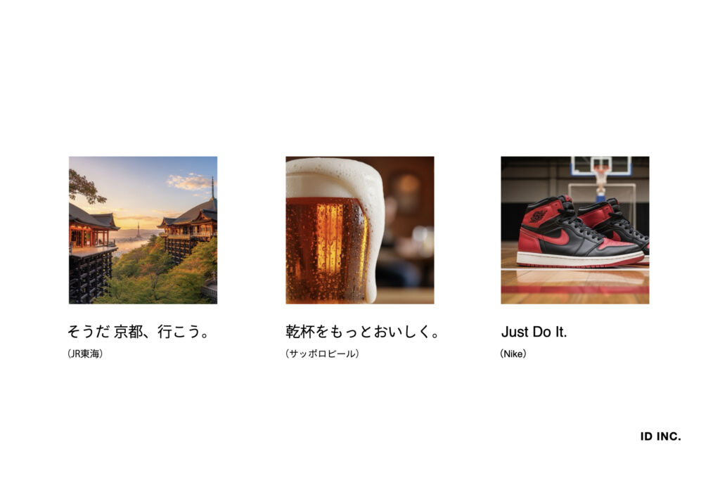 キャッチコピーは、広告デザインの中でも最も短い時間で顧客の心を動かす「言葉の武器」です。広告を見た瞬間、数秒で読むこのフレーズが、「自分に関係がある」「欲しい」と思わせるかどうかを左右します。企業やブランドの理念・商品の特徴を端的に伝え、受け手の興味や共感を引き出すには、強い言葉選びと表現の工夫が必要です。名作の例を3つ見てみましょう。