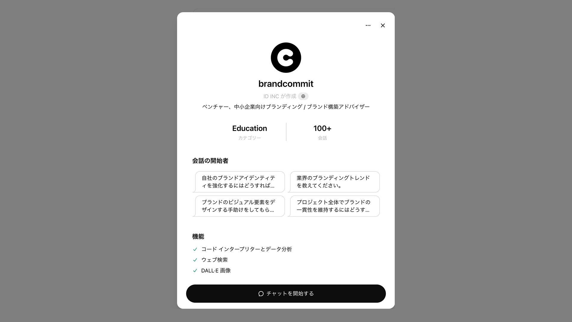 「GPTs」は、OpenAIが開発した高度な言語モデル「GPT」に搭載されたカスタムチャットボットです。brandcommitの「GPTs」では、ブランド構築に特化した知識を持ち、あなたの質問やお悩みに応じて適切な答えやアドバイスを提供するようチューニングされました。