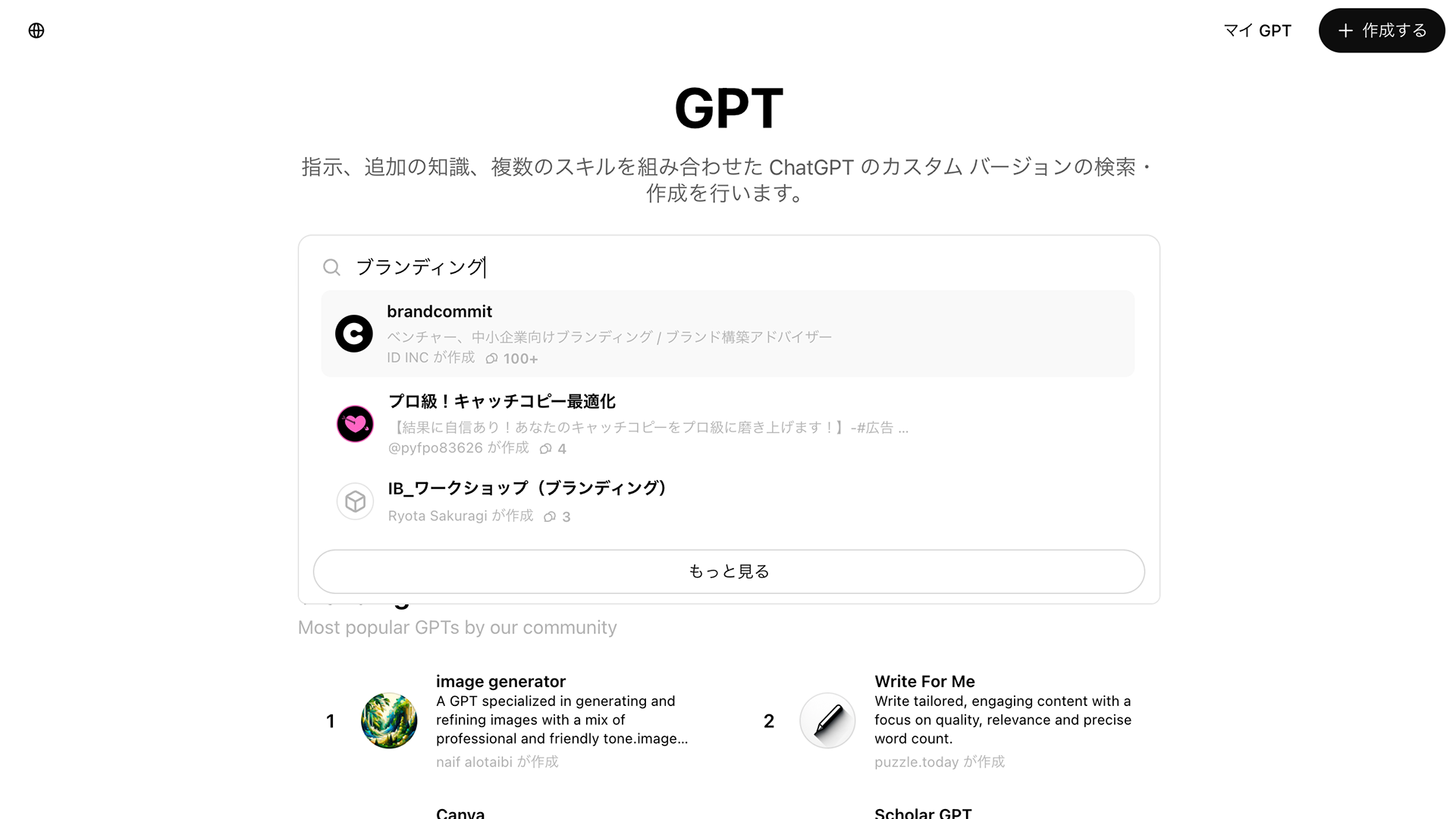 brandcommitの「GPTs」は、下記リンクまたはGPTsページから検索いただくとどなたでもご利用いただけます。検索バーに「brandcommit」または「ブランディング」と入力してみてください。