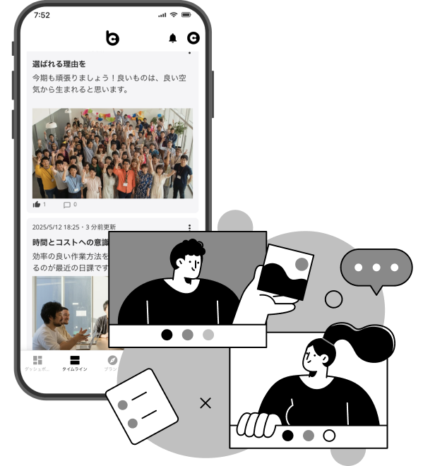 ブランド⼒を⾼める上で重要となる社員の意識向上や⾏動を促進する「Good Job タイムライン機能」を強化。予め策定した⾏動指針に沿った投稿を匿名で気軽におこなえる機能を実装。 またその投稿に対して「いいね」「コメント」がおこなえ、 内部でのブランド浸透活動として社員同⼠のエンゲージメントが⾼まり伝播していく仕組みを構築。