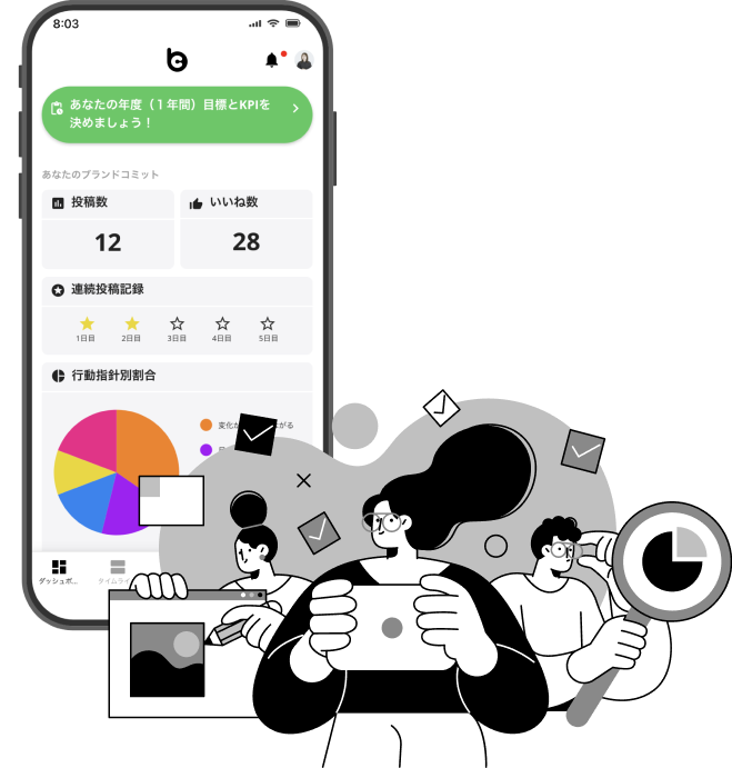 ブランディングは中⻑期間の継続活動が必要となり、外部へ委託できない⾃社で⾃⾛が必要な領域があります。そしてこれらの内部での活動は企業内で閉ざされることが多く、体系化された仕組みとして世の中に存在していません。このブランディング推進領域を「brandcommit」が⽀援する代表的な仕組みとなるよう、β2 版のテスト期間を経て正式サービスリリースを⽬指します。