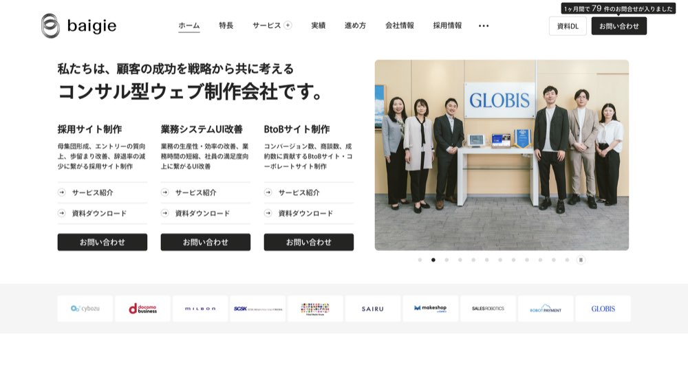 株式会社ベイジは、BtoB企業向けのコーポレートサイトやサービスサイトに特化した制作会社です。美しいデザインよりも「読みやすさ」「論理的な情報構造」「信頼感のある表現」を重視しており、専門性の高い業界でも正確に価値を伝えるコンテンツ設計を得意としています。特に製造業・IT・SaaS・人材系など、複雑なサービスを扱う企業からの依頼が多い傾向です。