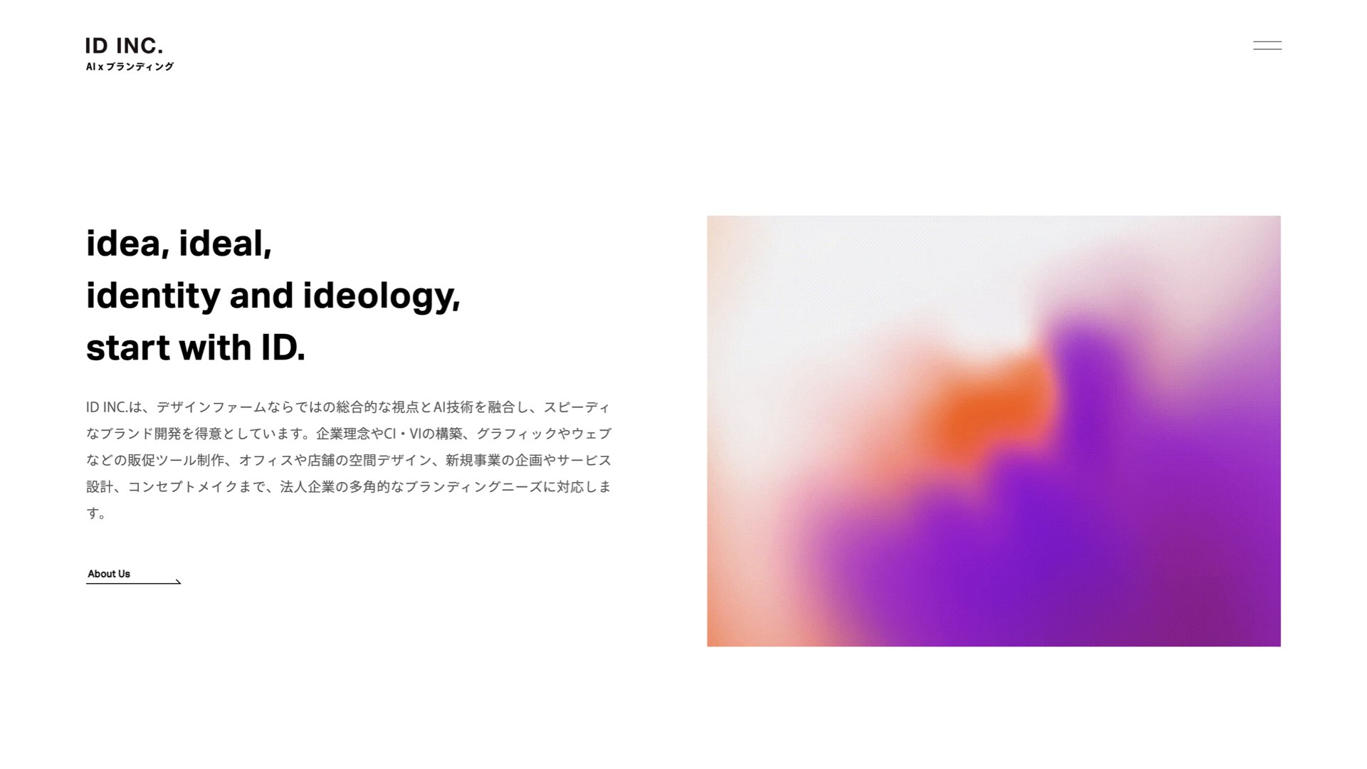 ID株式会社は、AI × ブランディングをテーマに掲げ、企業の価値を多面的に整理しながら、一貫した見え方をつくる支援を行う会社です。CI / VI の設計から企画、Web開発、空間デザインまで扱うため、ブランド方針を起点にした統合的な改善が進めやすい点が特徴です。