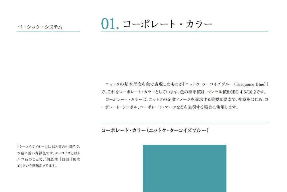 日本特殊塗料株式会社のCIマニュアルは、「創意工夫」という企業理念を視覚で表現するために整備された文書です。代表的なコーポレートカラー「ターコイズブルー」は、ロゴやシンボルに必ず用いられ、企業の理念とビジュアルを結びつけています。
