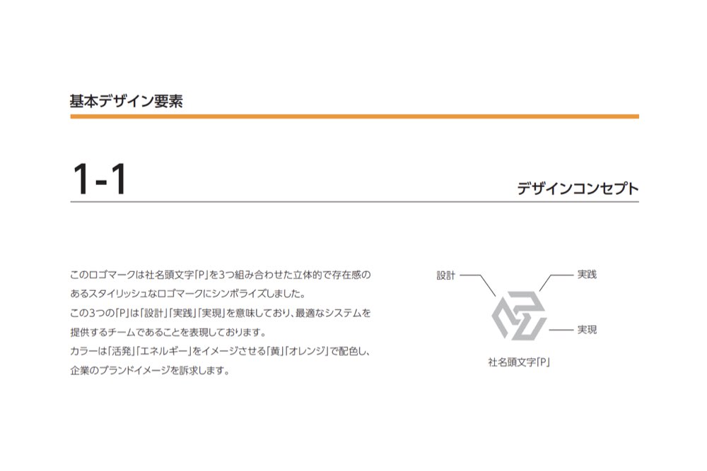 ロゴマークは社名の頭文字「P」を3つ組み合わせた立体的なデザインで、「設計」「実践」「実現」という企業の行動姿勢を象徴しています。カラーは「活発」「エネルギー」を想起させる「黄」「オレンジ」を基調としています。
