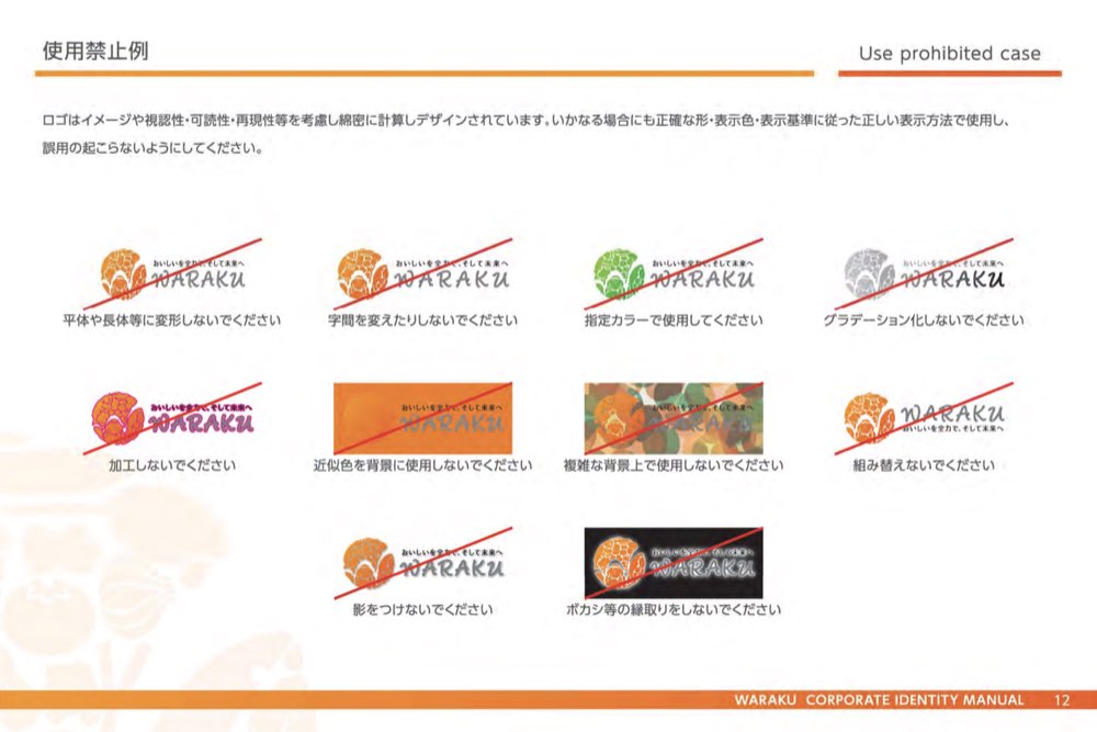 視覚ルールも厳密です。ロゴの最小サイズ、余白、背景色ごとの表示条件が数値で定義されています。さらに、比率の変更、ドロップシャドウ、縁取り、斜体化、3D加工、回転といった改変は禁止され、ブランドの整合性を守る仕組みを徹底しています。