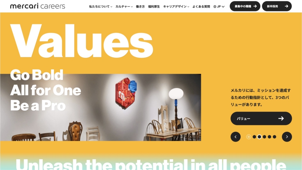 株式会社メルカリは、採用ブランディングにおいて「バリュー」と「ファンデーション」の2つの価値基準を明確に発信しています。