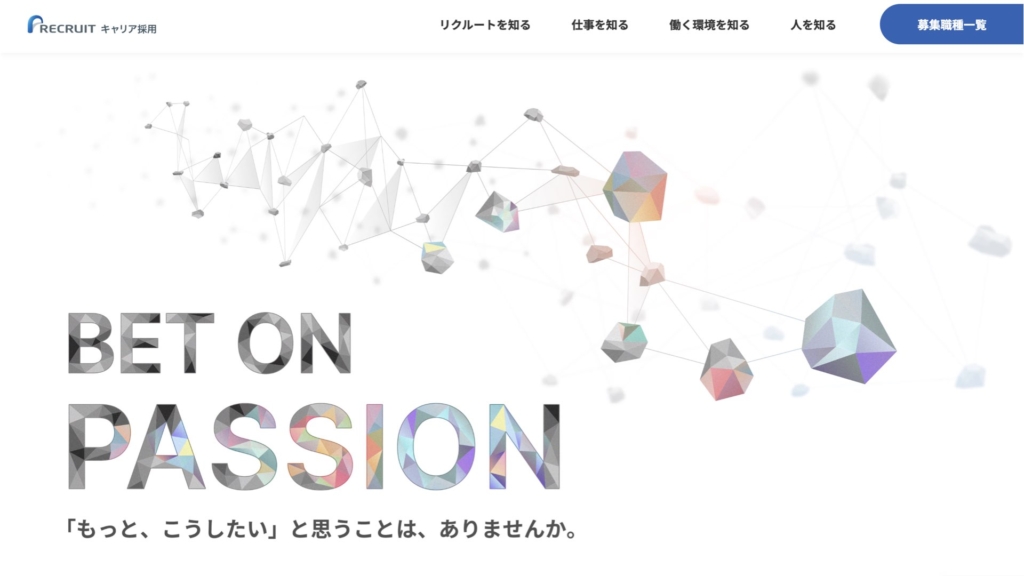 一方、キャリア採用サイトは「BET ON PASSION」というテーマを掲げ、清潔感のある明るい色合いと奥行きのある立体的なレイアウトが特徴です。多様な職種や働き方、キャリアパスを整理し、経験者が次のステージへ踏み出すことを後押しするようなデザインとなっています。