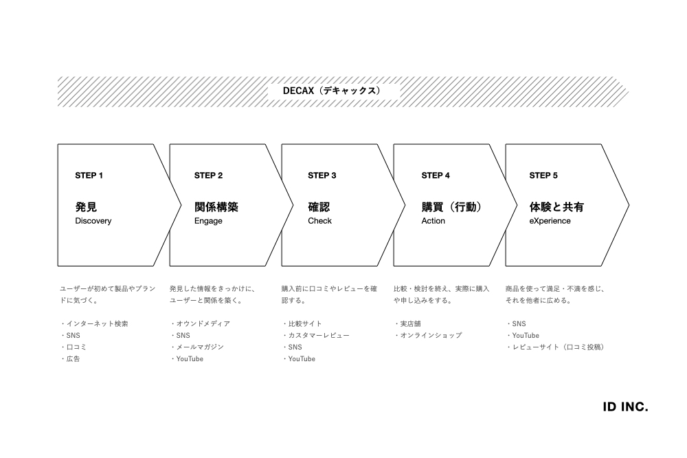 電通が提唱した消費者行動モデル「AISAS」に代わる新たなモデル「DECAX」が示すように、現代の購買プロセスは「発見→深掘り→確認→購買→体験・共有」という、ブランドとの深い関係構築を前提とした流れへと変化しています。ブランドストーリーは、この関係構築を加速させる最も効果的なコンテンツです。