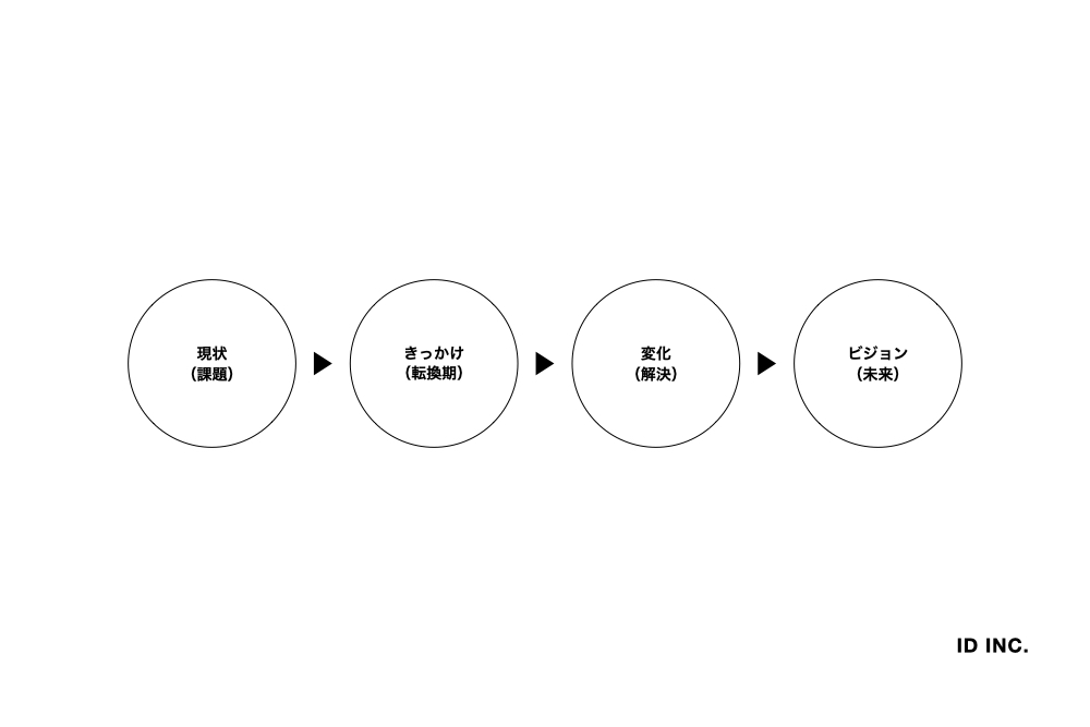 一般的なブランドストーリーの構造は「現状(課題)→きっかけ(転換点)→変化(解決)→ビジョン(未来)」という流れです。顧客がこの流れを読んだとき、自分も同じ変化を体験できるというイメージが持てることが重要です。